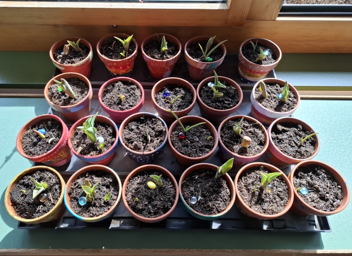 Unsere Tulpen wachsen. Wie hoch sie wohl wachsen und wie sie wohl aussehen werden?